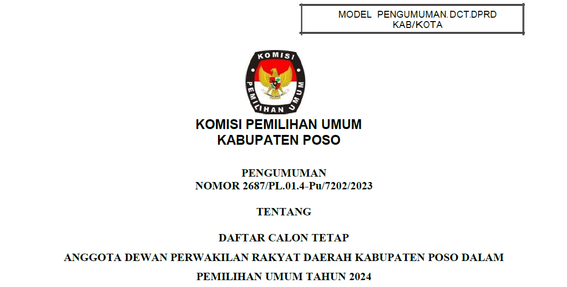 Bahwa untuk melaksanakan ketentuan Pasal 85 ayat (1) Peraturan KPU Nomor 10 Tahun 2023 tentang Pencalonan Anggota Dewan Perwakilan Rakyat, Dewan Perwakilan Rakyat Daerah Provinsi, dan Dewan Perwakilan Rakyat Daerah Kabupaten/Kota dan berdasarkan Keputusan Komisi Pemilihan Umum Kabupaten Poso Nomor 2686 Tahun 2023 tentang Daftar Calon Tetap Anggota Dewan Perwakilan Rakyat Kabupaten Poso Dalam Pemilihan Umum Tahun 2024 tanggal 3 November 2023, Komisi Pemilihan Umum mengumumkan Daftar Calon Tetap (DCT) Anggota Dewan Perwakilan Rakyat Kabupaten Poso dan persentase keterwakilan perempuan dalam DCT sebagaimana terlampir. Data lengkap calon tetap Anggota DPRD Kabupaten Poso dapat dilihat melalui portal publikasi https://infopemilu.kpu.go.id/Pemilu.