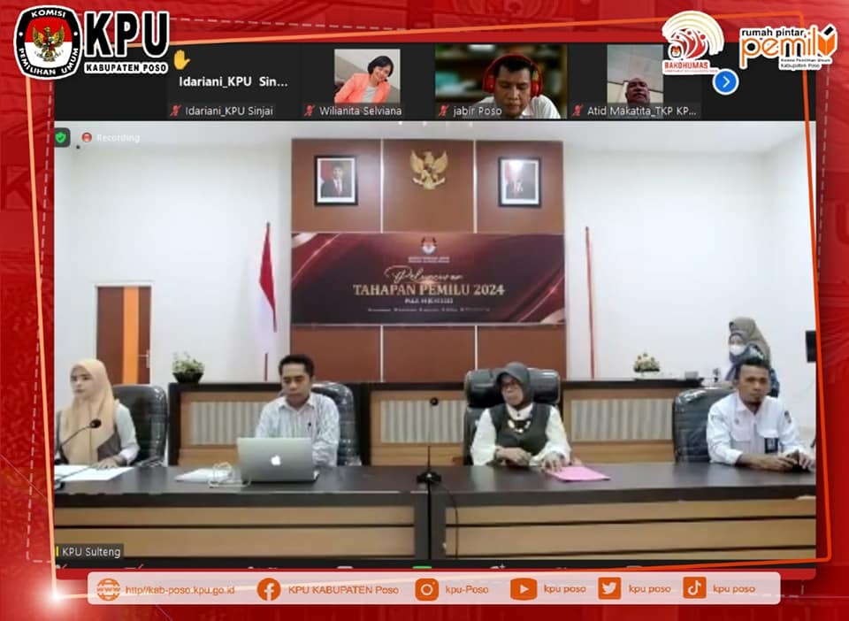 #TemanPemilih Kamis 23 Juni 2022, Ketua KPU Kabupaten Poso Budiman Maliki, Anggota Wilianita S Pangetty, Whisnu Pratala, Taufik Hidayat, Olivia Salintohe, Sekretaris Hamzah, Kasub Tekmas Jumirin Syaipuddin serta Staf Tekmas mengikuti kegiatan Dialog Virtual seri #7 Pendidikan Pemilih dengan tema "Partisipasi dan Hak Masyarakat Dalam Pembentukan Regulasi Pemilu Serentak Tahun 2024" yang diselenggarakan secara Virtual oleh KPU Provinsi Sulawesi Tengah.