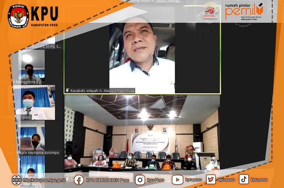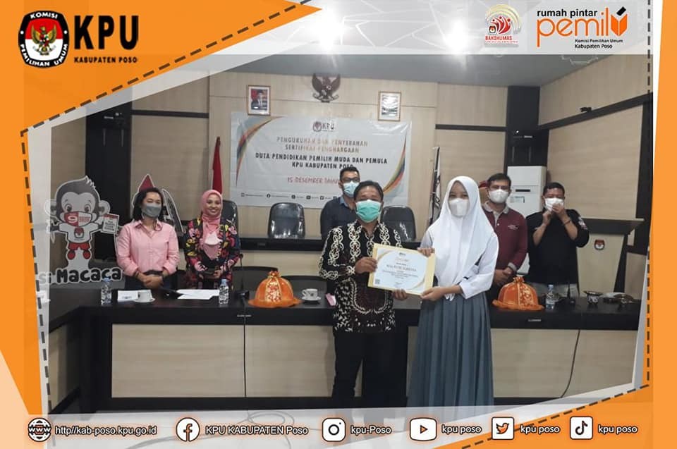 #TemanPemilih Rabu 15 Desember 2021, KPU Kabupaten Poso Sukses menggelar kegiatan Pengukuhan dan Penyerahan Sertifikat Penghargaan Duta Pendidikan Pemilih Muda dan Pemula KPU Kabupaten Poso Tahun 2021 yang di selenggarakan secara daring dan luring.