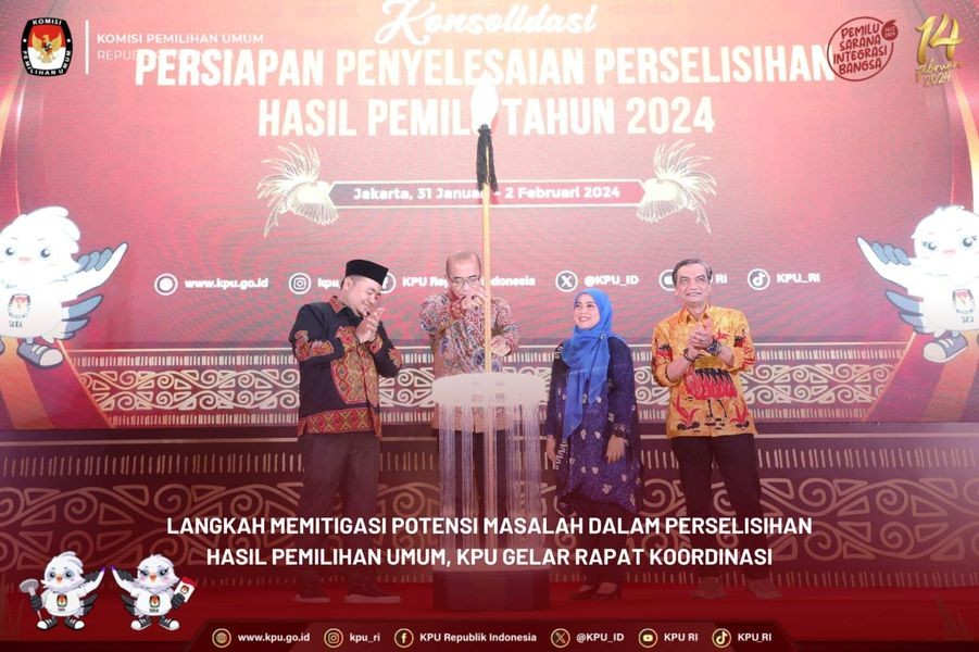 Jakarta, kpu.go.id - Jelang 13 hari menuju pemungutan suara, Komisi Pemilihan Umum (KPU) mengadakan Konsolidasi Persiapan Penyelesaian Perselisihan Hasil Pemilihan Umum (PHPU) Tahun 2024, di Jakarta, Rabu (31/1/2024). Kegiatan ini dihadiri langsung Ketua KPU Hasyim Asy’ari, Anggota KPU Mochammad Afifuddin, Betty Epsilon Idroos, Yulianto Sudrajat, serta Parsadaan Harahap.
