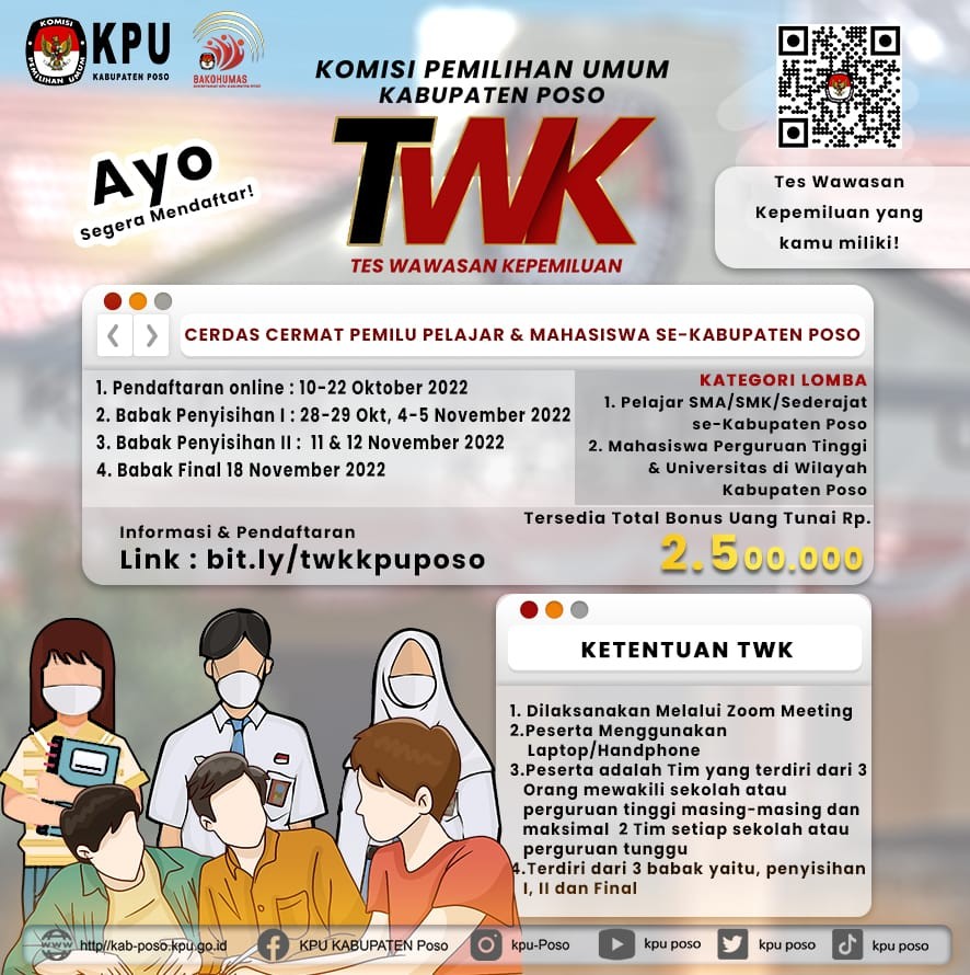 #Temanpemiilih Komisi Pemilihan Umum Kabupaten Poso akan melaksanakan Tes Wawasan Kepemiluan, Cerdas Cermat Pemilu Pelajar dan Mahasiswa se-Kabupaten Poso.