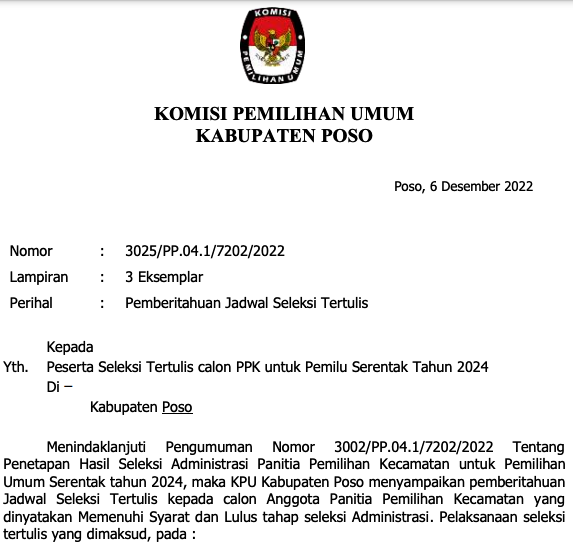 poso-kab.kpu.go.id - Jumat, 18 November 2022 KPU Kabupaten Poso laksanakan sosialisasi Peraturan KPU nomor 6 tahun 2022 tentang Penataan Daerah Pemilihan (Dapil) dan Alokasi Kursi Anggota DPR Kabupaten Kota dalam Pemilihan Umum. Sosialisasi ini digelar dengan metode hybrid yaitu secara luring atau tatap muka langsung di ruang rapat kantor KPU Kabupaten Poso dan melalui daring zoom meeting juga livestreaming Facebook KPU Kabupaten Poso.