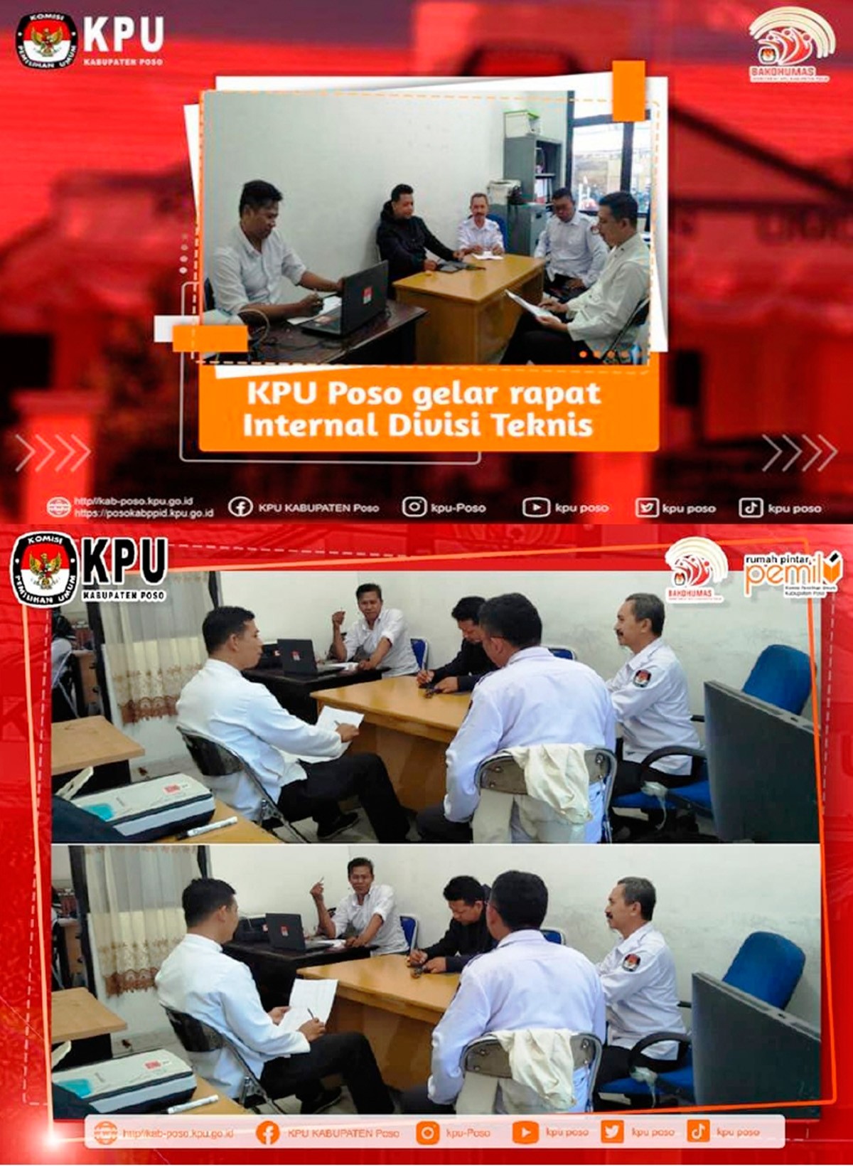 kab-poso.kpu.go.id ketua Divisi Teknis Penyelenggara KPU Kabupaten Poso, Taufik Hidayat dan Kapala Sub Bagian Divisi Tekmas Jumirin Syaipuddin bersama staf divisi teknis melaksanakan rapat internal pada Rabu 20/4/2022. kegiatan yang dilaksanakan diruang kerja Divisi Teknis tersebut membahas persiapan tahapan penerimaan dan verifikasi administrasi dokumen partai politik peserta pemilu tahun 2024. pada rapat persiapan tahapan tersebut, Ketua Divisi Teknis dan penyelenggara KPU Kab Poso, Taufik Hidayat dalam paparanya menenyampaikan bahwa untuk penguatan menghadapi tahapan penerimaaan dan verifikasi administrasi dokumen partai politik, dengan berbagai pengalaman pemilihan sebelumnya, maka akan dibagi tugas dan tanggung jawab dalam hal penerimaan, penelitian dan verifikasi faktual mencakup persyaratan partai politik peserta pemilu. selain itu, taufik mengatakan, dalam pembentukan tim kerja, masing - masing harus ada penanggung jawab dan pendamping yang mulai saat ini sudah disusun rancangannya, serta kesiapan kebutuhan dan pembagian penerimaan dokumen persyaratan pendaftaran partai poltik yang wajib diserahkan ke KPU Kabupaten Poso. ditempat yang sama Kasubbag Tekmas Jumirin Syaifuddin menambahkan, terkait dengan tahapan tersebut sudah mempersiapkan dokumen pendukung dan daftar nama staf yang akan ikut pada kegiatan tahapan tersebut" saya sudah menyiapkan daftar nama dan jumlah tim kerja yang akan bertanggung jawab pada masa tahapan penelitian dan verifikasi dokumen persyaratan partai politik"ujar jumirin" pada masa persiapan pedanftaran ini, Divisi Teknis KPU Kabupaten Poso terus melakukan komunikasi dan koordinasi serta evaluasi internal dalam rangka mengoptimalkan proses persiapan penerimaan dan verifikasi dokumena perserta pemilu.