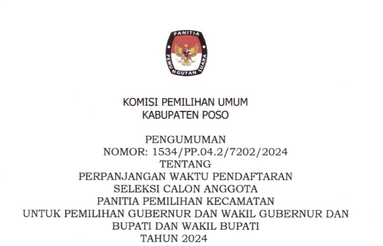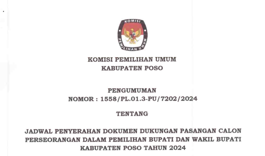Poso, https://kab-poso.kpu.go.id KPU Kabupaten poso melakikan sosialisasi pencalonan bupati dan wakil bupati dalam pemilihan serentak tahun 2024 pada senin 6 mei. yang di pimpin langsung oleh ketua divisi Teknis dan Penyelenggara Pemilu Roni Mathindas dan turut di ikuti oleh Ketua KPU Poso Muh Ridwan Dg Nusu, Mansur, Alfred Sabintoe, dan Dewi Yul Nawawi, hadir juga dalam kegiatan ini Bawaslu Kabupaten Poso serta perwakilan partai politik dan tokoh masyarakat.