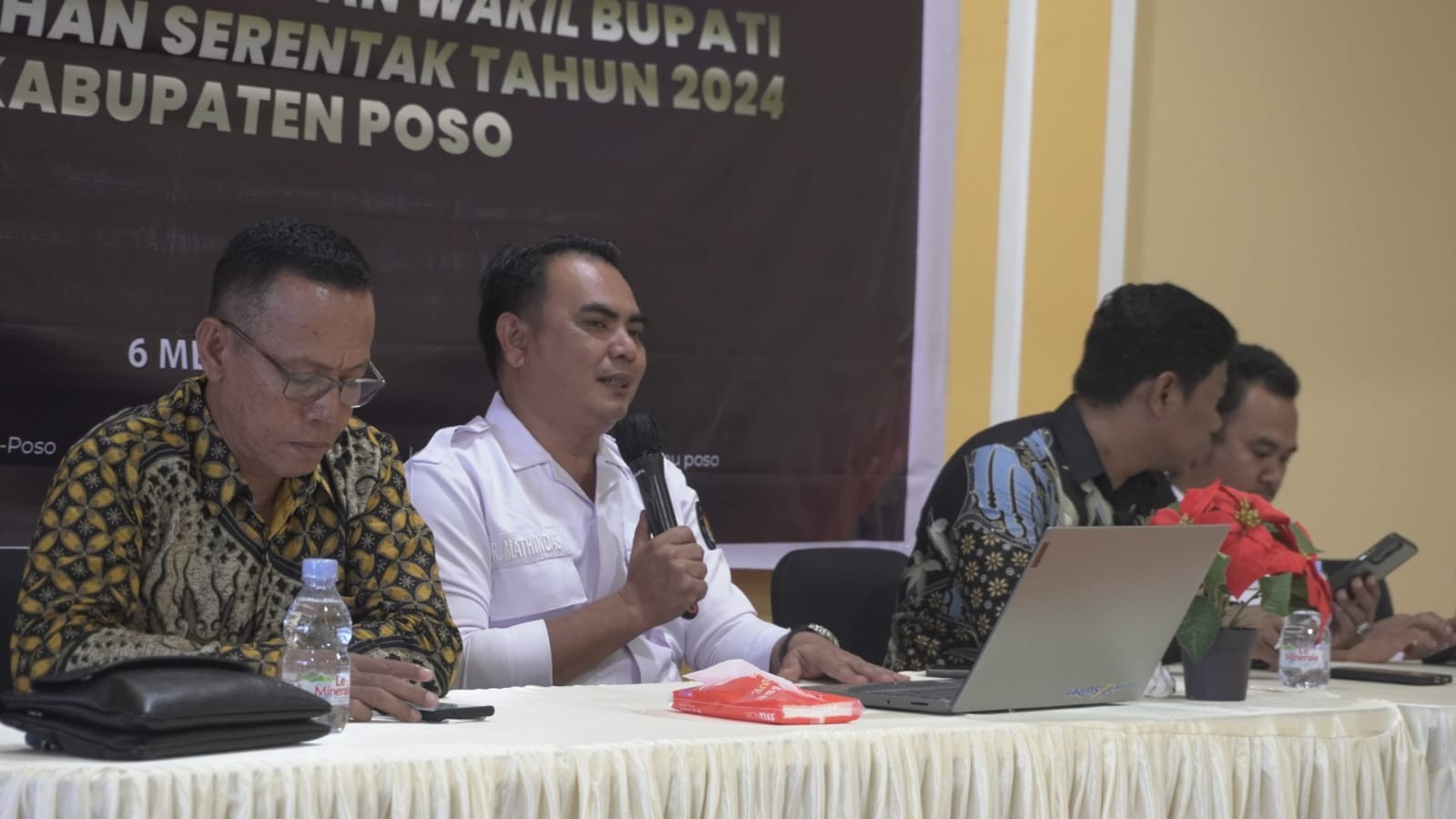 dalam materinya Roni Mathindas menyampaikan syarat- syarat wajib yang harus di penuhi oleh calon Bupati dan Wakil Bupati sebelum mendaftarkan diri sebagai calon peserta dalam pemilihan bupati dan wakil bupati tahun 2024 di kabupaten poso [Humas KPU Poso, Fr]