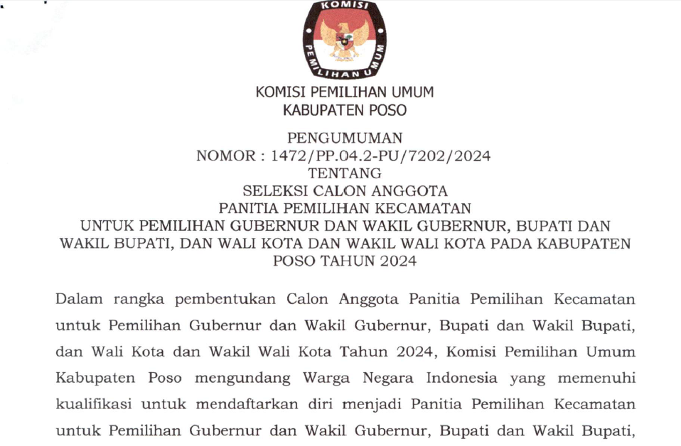 Poso, https://kab-poso.kpu.go.id KPU Kabupaten poso melakikan sosialisasi pencalonan bupati dan wakil bupati dalam pemilihan serentak tahun 2024 pada senin 6 mei. yang di pimpin langsung oleh ketua divisi Teknis dan Penyelenggara Pemilu Roni Mathindas dan turut di ikuti oleh Ketua KPU Poso Muh Ridwan Dg Nusu, Mansur, Alfred Sabintoe, dan Dewi Yul Nawawi, hadir juga dalam kegiatan ini Bawaslu Kabupaten Poso serta perwakilan partai politik dan tokoh masyarakat.