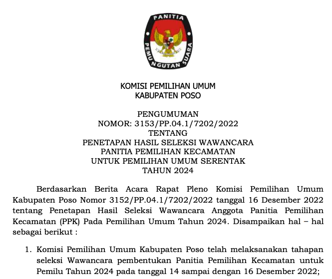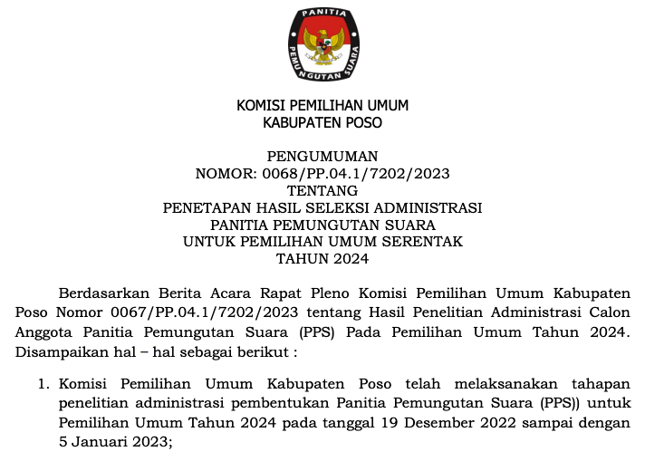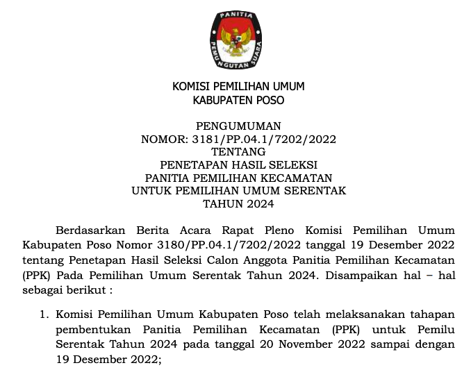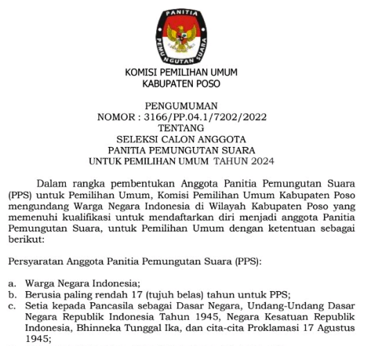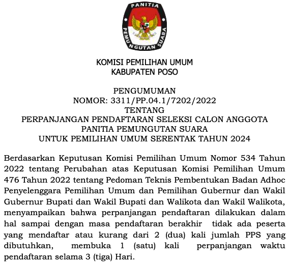 Sehubungan dengan terbitnya Keputusan Komisi Pemilihan Umum Nomor 534 Tahun 2022 tentang Perubahan atas Keputusan Komisi Pemilihan Umum Nomor 476 Tahun 2022 tentang Pedoman Teknis Pembentukan Badan Adhoc Penyelenggara Pemilihan Umum dan Pemilihan Gubernur dan Wakil Gubernur, Bupati dan Wakil Bupati, dan Walikota dan Wakil Walikota yang mengatur mengenai perubahan jadwal pembentukan PPS di dalamnya dengan ini, KPU Kabupaten Poso menyampaikan hal-hal sebagai berikut: