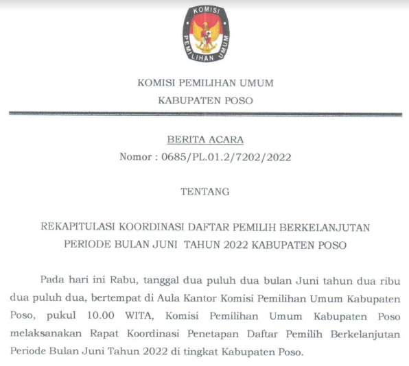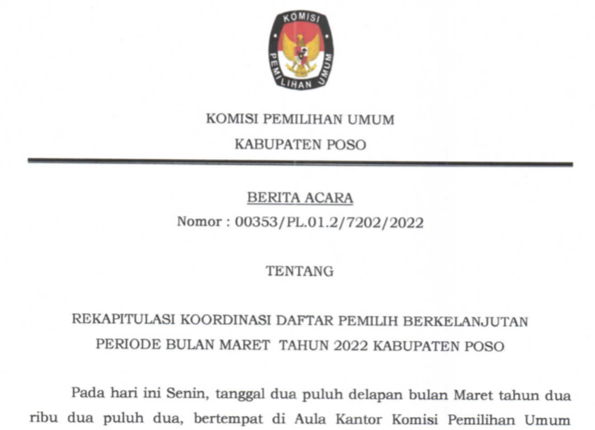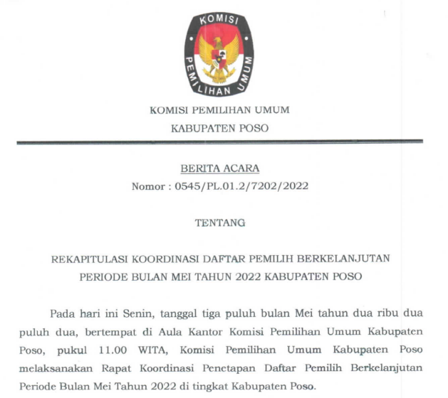 Berdasarkan ketentuan Peraturan Komisi Pemilihan Umum Nomor 6 Tahun 2021, hasil Rapat Koordinasi yang dilakukan oleh KPU Kabupaten Poso menghasilkan hal sebagai berikut: Rekapitulasi Daftar Pemilih Berkelanjutan dengan jumlah sebanyak 156.369 (Seratus lima puluh enam ribu tiga ratus enam puluh sembilan) ) dengan rincian pemilih laki-laki berjumlah 79.099 (Tujuh puluh sembilan ribu sembilan puluh sembilan) pemilih dan pemilih perempuan berjumlah 77.270 (Tujuh puluh tujuh ribu dua ratus tujuh puluh) pemilih pemilih, tersebar di 19 (sembilan belas) Kecamatan sesuai dengan rincian sebagaimana terlampir dalam Berita Acara ini. BA DPB Periode Mei Tahun 2022 Model A-DPB Mei Tahun 2022 Pastikan diri anda terdaftar sebagai pemilih di Pemutakhiran Daftar Pemilih Berkelanjutan Tahun 2022. Untuk memastikan Anda terdaftar sebagai pemilih, silahkan cek di Lindungihakpilihmu atau unduh APK Lindungi Hakmu di Play Store. Bagi anda warga Kabupaten Poso, yang belum terdaftar sebagai pemilih, mengalami perubahan identitas kependudukan, masuk pemilih pemula (baru berusia 17 tahun/pensiunan TNI/Polri) atau ada keluarga yang sudah meninggal dunia, silahkan mendaftar, memperbaiki identitas daftar pemilih atau melaporkan keluarga yang meninggal dengan mengisi formulir di bawah disini atau datang langsung di Kantor KPU kabupaten Poso