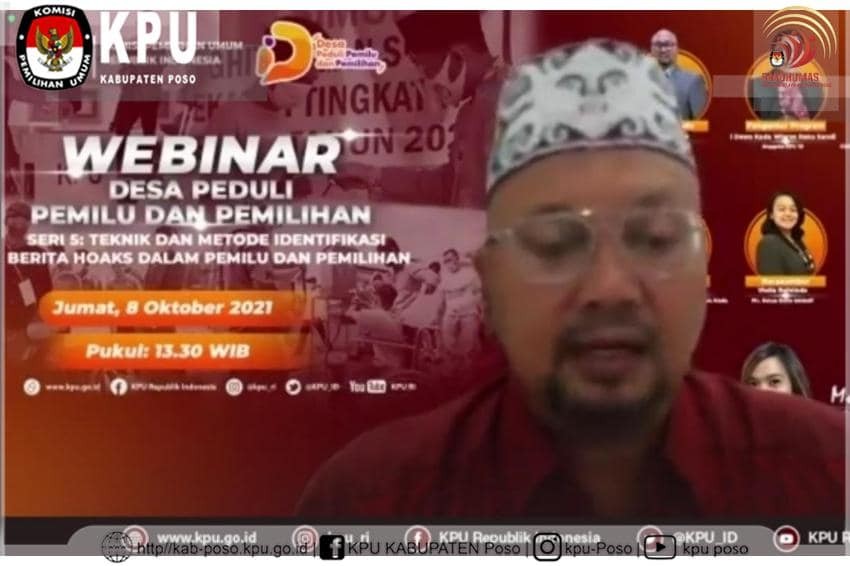 Jumat, 8 Oktober 2021 Ketua Divisi Sosialisasi, Pendidikan Pemilih, Partisipasi Masyarakat dan SDM KPU Kabupaten Poso juga mengikuti kegiatan Webinar Desa Peduli Pemilu dan Pemilihan seri 5 : Teknik dan Metode Identifikasi Berita Hoaks Dalam Pemilu dan Pemilihan yang diselenggarakan secara Virtual oleh KPU RI.